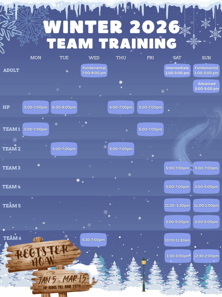 Please refer to the times and dates below for the Winter 2026 Group Training sessions.